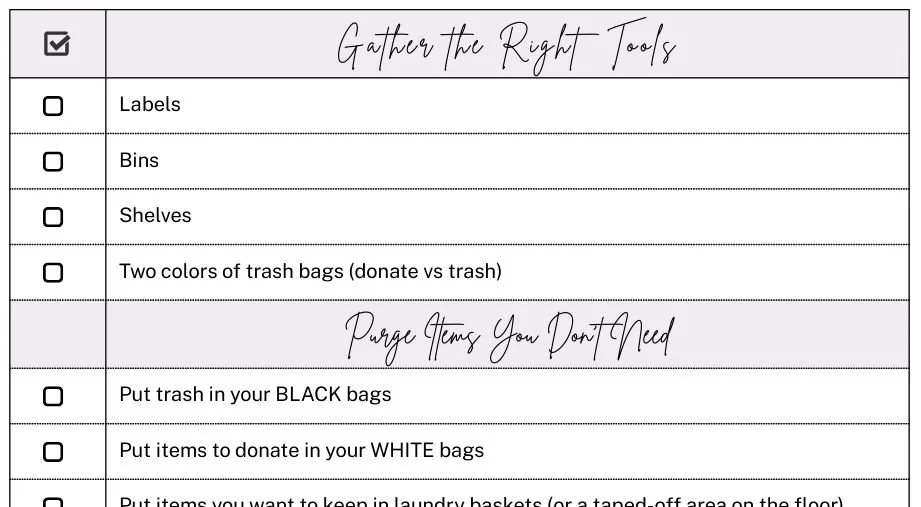 This week’s checklist is a HOW-TO declutter. What tools do you need? How do you sort the items you want vs. throw away? How do you store the items you want to keep and where?